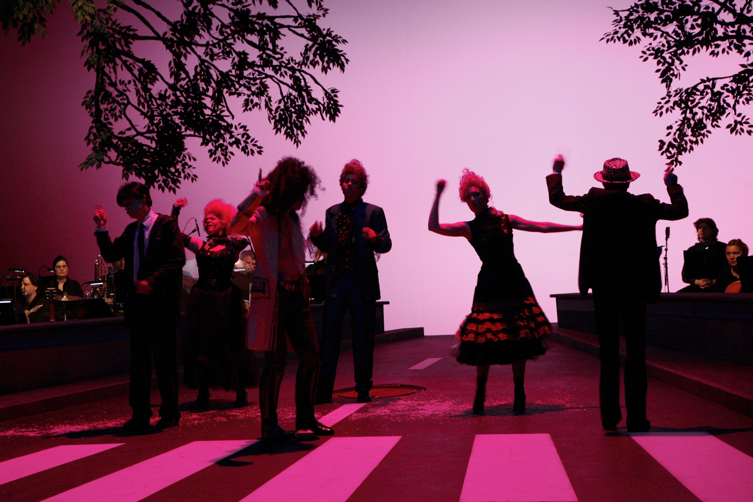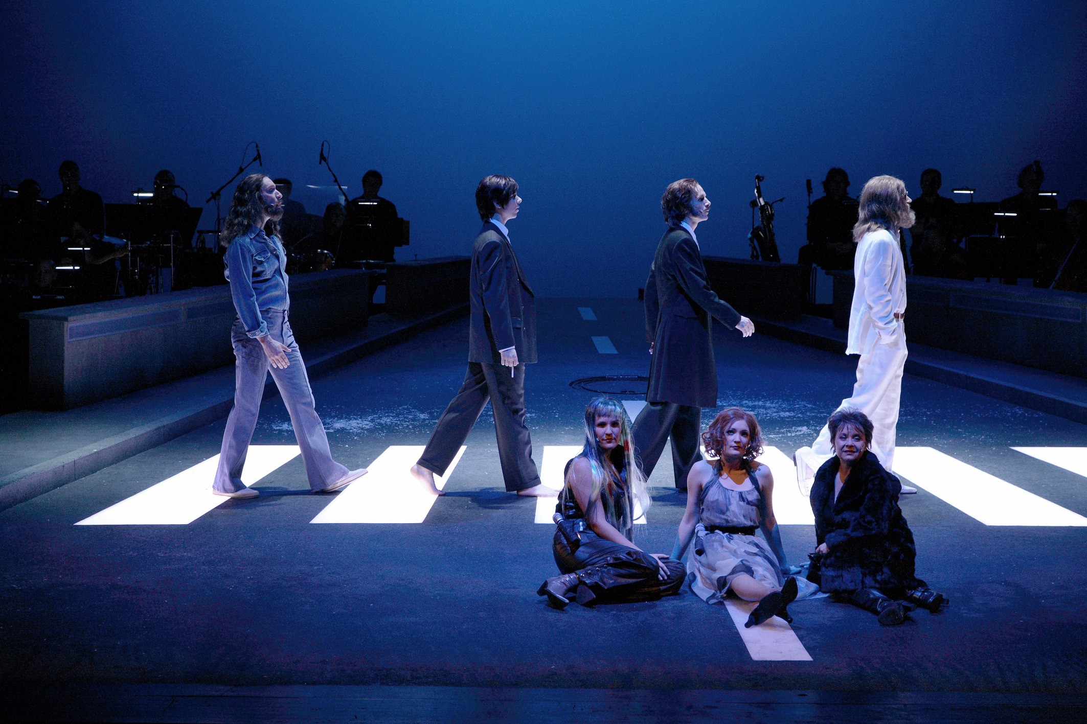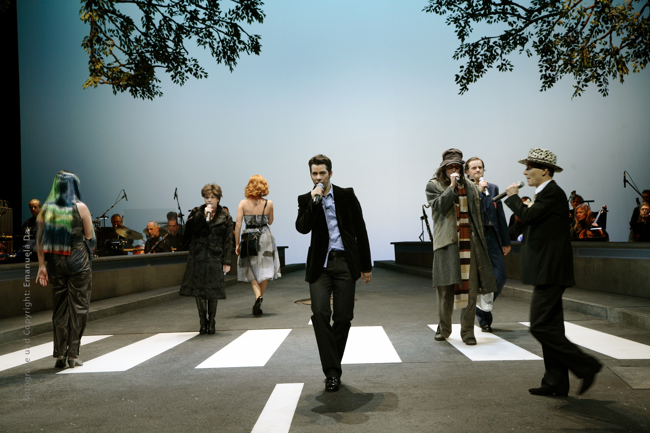 Auf der Bühne stellt Huber das berühmte Foto des Platten-Covers nach. Ein leuchtender Zebrastreifen, ins Bild hineinragende Äste - Morgenstimmung in der Londoner Abbey Road. Nur die Beatles und die parkenden Autos fehlen. Das Orchester sitzt rechts und links des Bordsteins und begleitet den Bettler, der "Come Together" ins Mikrofon dröhnt.