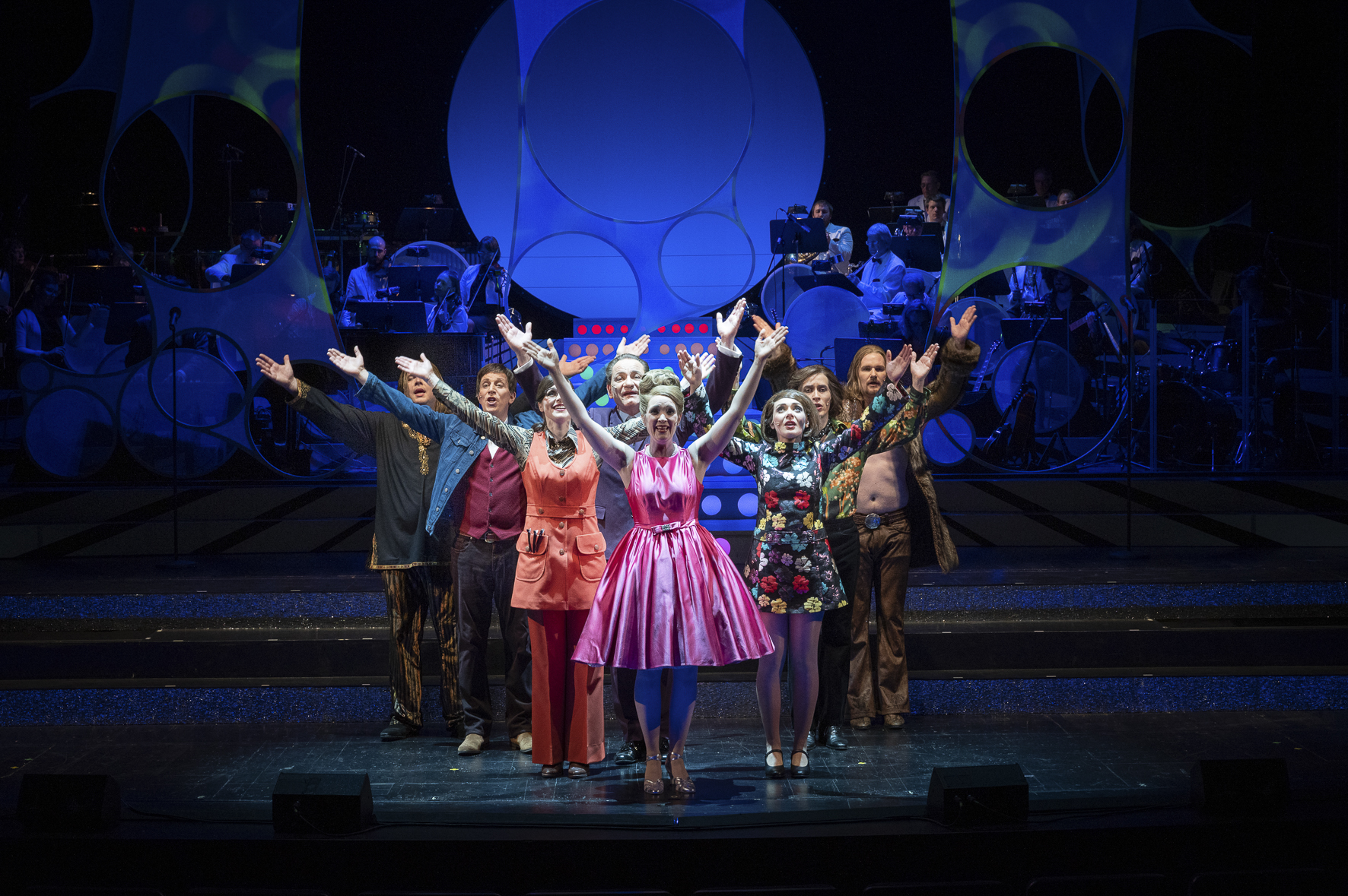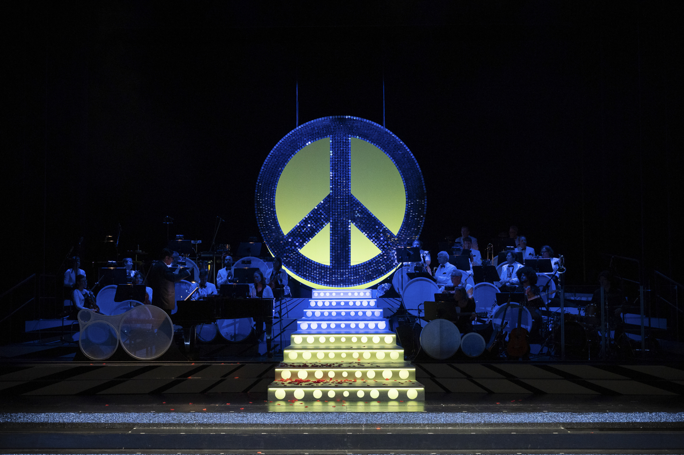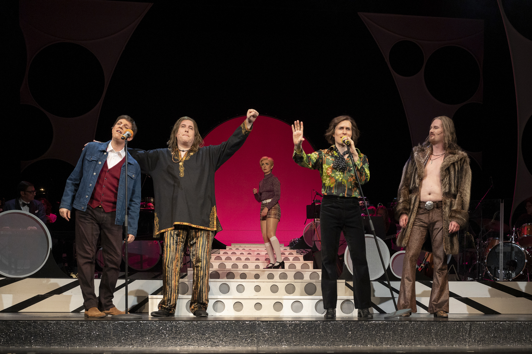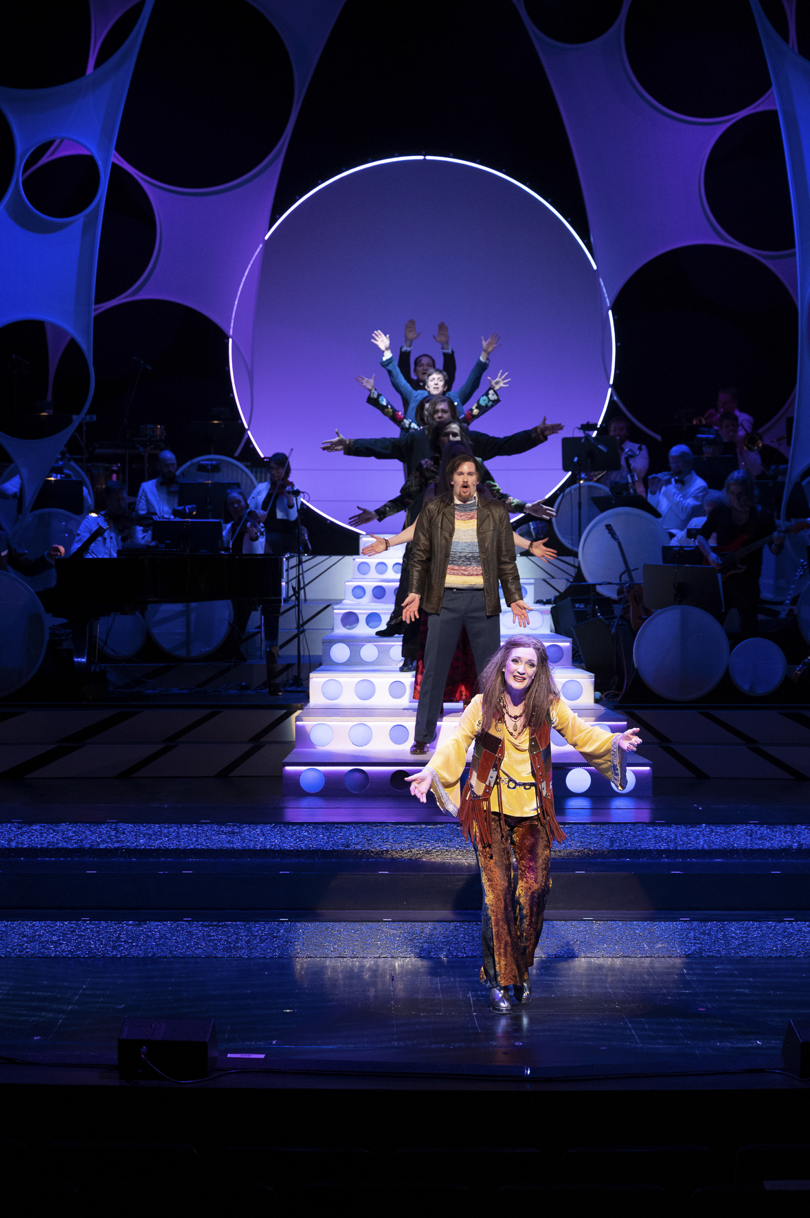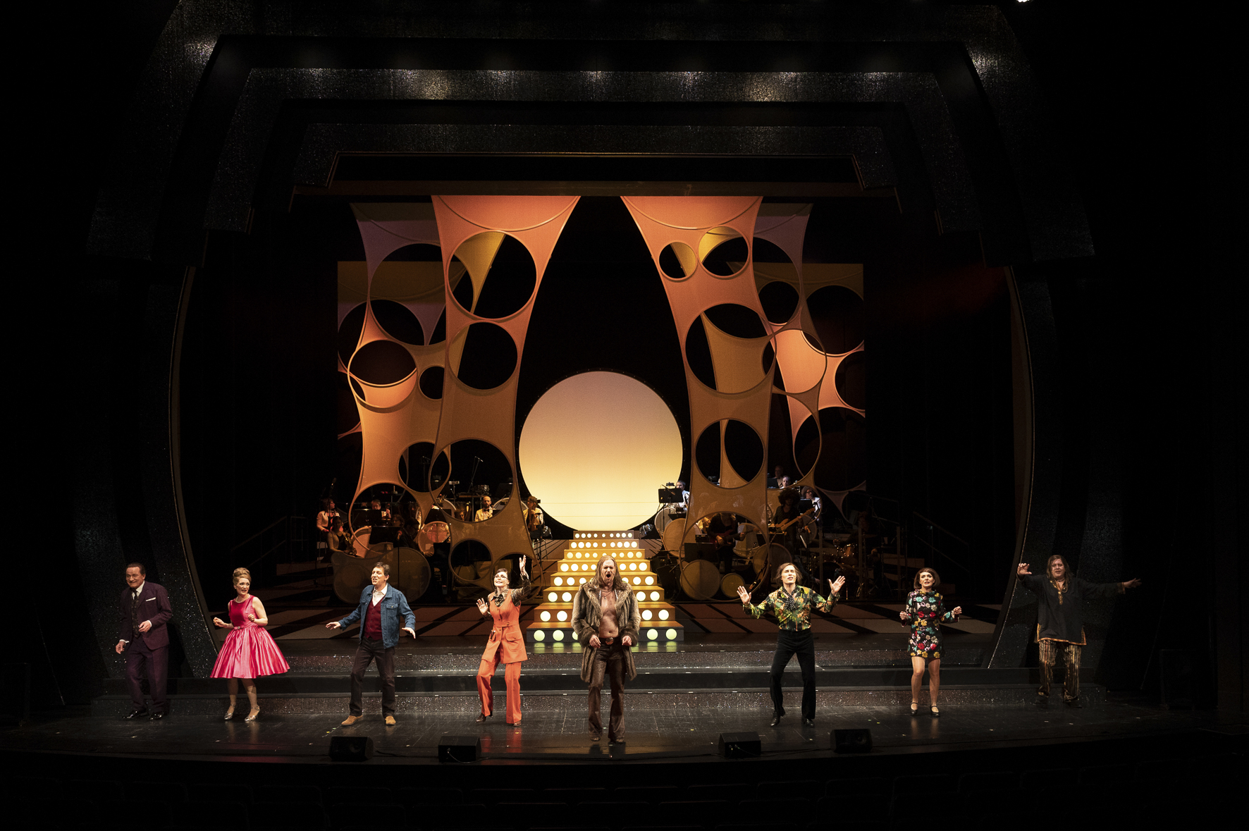„Eigentlich ist diese Musik 50 Jahre alt, unsere Eltern oder gar Großeltern haben sie gehört, und doch kann man jeden einzelnen Song mitsingen, sie stammen aus den Jahren 1965 - 1971 aus einer politisch turbulenten Zeit für Deutschland und für die ganze Welt. Auch damals sangen die Menschen für Frieden und für Menschenrechte, auch damals waren sie froh über ein paar Stunden Unterhaltung die Konflikte und Krieg vergessen machten. Die musikalische Revue von Kai Tietje und Stefan Huber ist eine Art deutsches „Rock of Ages“, oft genauso lustig und doch historisch gründlich verankert in der Zeit als man noch West-Berlin sagte und es im Fernsehen noch einen Sendeschluss gab. Die Bühne ist ein riesiges altmodisches Fernsehgerät, der Abend beginnt mit einem Schwarz-Weiß-Film, der binnen Sekunden all die Themen jener Zeit anschneidet – Vietnamkrieg, Woodstock, Kommune und APO, Rudi Dutschke und Benno Ohnesorg, Start des Farbfernsehens, Antibabypille, den Mord an Martin Luther King, die Beatles. Und schon sind wir mittendrin in einer typischen deutschen Fernsehshow von damals. Vico von Kulenburg heißt der joviale Moderator und vereint all die Vico Torrianis und Hans-Joachim Kulenkampffs der Zeit in sich. Er hat, wie es damals üblich war, eine flotte Assistentin, er hat vor allem ein riesiges Showorchester samt musikalischem Leiter, das die komplette Showtreppe der schicken 60er- Jahre-Dekoration füllt. Drei fehlende Musiker werden, kurz bevor die Liveshow beginnt, durch die Mitglieder einer Rockband ersetzt, die einer der Stars des Abends mitgebracht hat. Und genau da beginnt das Problem. Denn man hat, um sich modern zu geben, zu altem deutschen Liedgut ein bisschen was von der neuen Musik der jungen Leute eingeladen. Der Abend beginnt mit einer gruselig familienfreundlichen Version von „Satisfaction“ und endet völlig losgelöst mit einem großen Peace-Zeichen über Marihuana-Wolken mit Anti-Imperialismus-Parolen und einem Publikum das inbrünstig John lennons „Imagine“ mitsingt. Nicht nur der aufmüpfige Regievolontär der Fernsehshow neigt zur „außerredaktionellen Opposition“ und lässt den Abend komplett entgleisen, auch einige der Gaststars scheinen direkt aus Woodstock entsprungen. Hier prallen Welten aufeinander - deutsche Schlagerstars, Hippies und Rocker, alle von Heike Seidler in perfekt zeitgemäße Kostüme gehüllt: Pullunder für die Redakteure, enge Samthosen samt Fönfrisur für den Schlagerstar und echte schmuddelige Hippieklamotten. José Luna lässt die Stars hinten durch einen James-Bond-Kreis auftreten, die niedlichen weißen Kreiselemente der Show Dekoration mutieren, wenn man sie in Regenbogenfarben anleuchtet, zu psychedelischen Bubbles. Bis auf Stefan Eichberg als Vico spielen alle Darsteller Doppelrollen einmal als Teil des biederen Fernsehteams und dann als Sänger auf der Showbühne. Regisseur Huber und Dirigent Tietje haben ihnen sprechende Namen gegeben. Pablo Guaneme Pinilla etwa vereint als Christoph Ähnlich sämtliche Klischees von Peter Maffay und Michael Holm bis Christian Anders. Sarah Finkel trägt italienische Schlager bei und findet als Vicos Assistentin Barbara kichernden Gefallen an überdimensionalen Joints. Eve Rades und Julia Klotz decken gefühlsvoll den alternativen Folk und die amerikanischen Songwriterinnen ab. Arlen Konietzund Oliver Firit die Rocker und Hippies, Gabriel Kemmether mäandert von Peter Alexander zu Reinhard Mey und Hildegard Knef. Über jedem Auftritt der etwa 30 Nummern schwebt ein Hauch liebevoller Ironie der die Manierismen und typischen Ticks von damals aufspießt. Die unglaubliche Detailfreude in Inszenierung, Ausstattung und den tollen Arrangements macht einen tollen Teil des Spaßes aus. Und so prallt mein „Freund der Baum“ auf „Eloise“, „Those were the days“ auf „Die Liebe ist ein Festmenü“ und „Cinderella Rockefella“ auf „Arrivederci Hans“. Wir hören „Mendocino“, „ Me an Bobby McGee“, „Aquarius“ und „Stairway to Heaven“, mit „Next Stop is Vietnam“ sind wir dann wirklich bei Woodstock und die Bühne bebt. Wie stark konnte die Rockmusik damals das brave Bürgertum doch bis in den Kern verunsichern! Flugblätter flattern ins Publikum und alle singen „Stop the war“ , das war bei der Ur- und Corona-bedingt einzigen Aufführung des Stücks im Herbst 2020 nicht so brandaktuell wie heute. Dem Pathos von „What a wonderful world“ und „Give peace a chance“ kann man sich derzeit nur schlecht entziehen. Dirigent Tietje lässt letzteren Titel ganz still ausklingen, zuletzt singt nur noch leise das Publikum. Der musikalische Leiter hat ein Orchester versammelt, das manch reduzierte West-End-Besetzung in den Schatten stellt. Zu seinen Arrangements gehören auch noch schöne Backgroundchöre. Herrlich, wenn in „Born to be wild“ kurz der damals populäre Ententanz reinknallt. Jukebox-Musical kann auch Bildung vermitteln, lernen wir in dieser höchst amüsanten Geschichtsstunde in deutscher Unterhaltungskunst.“