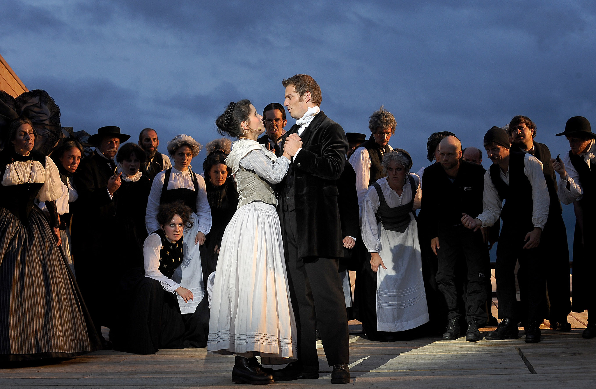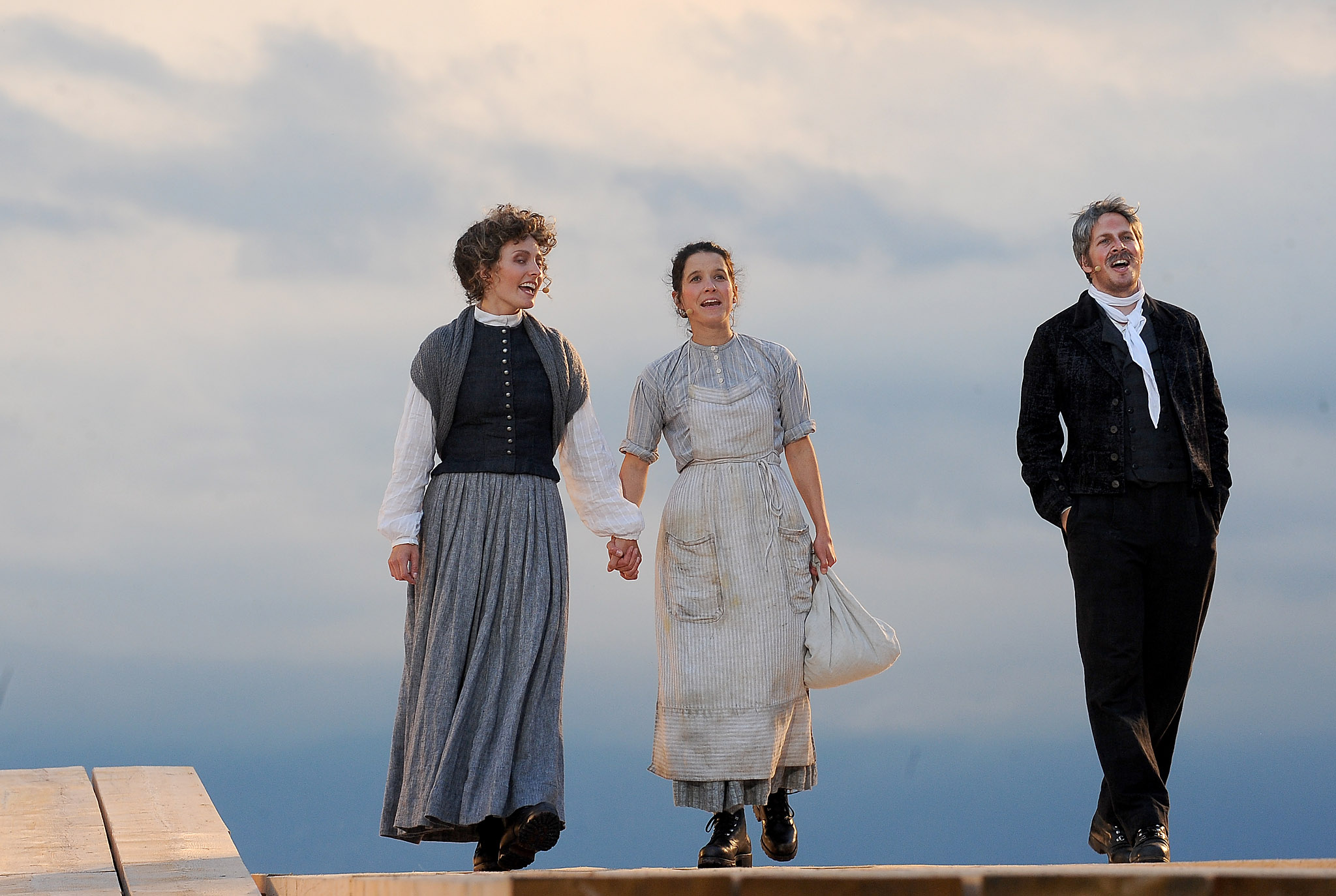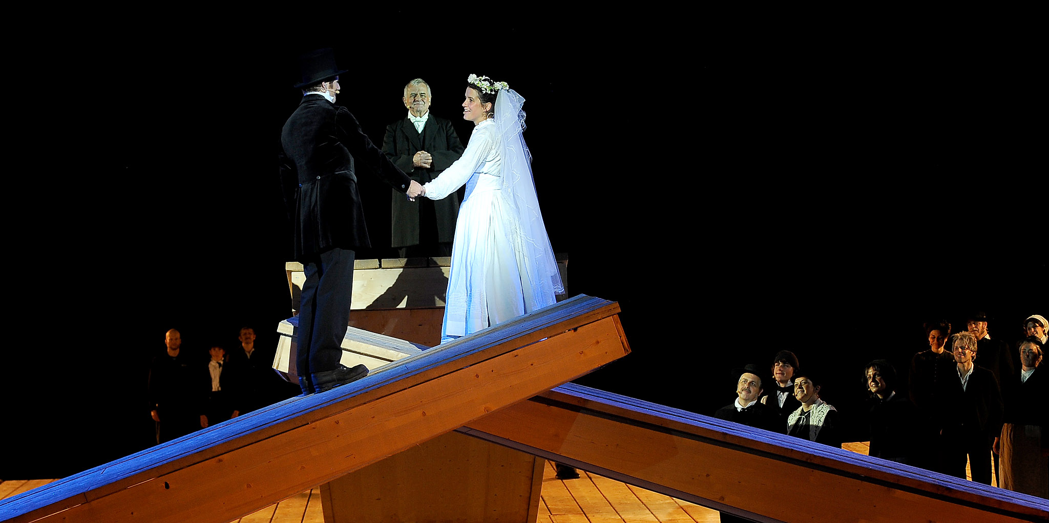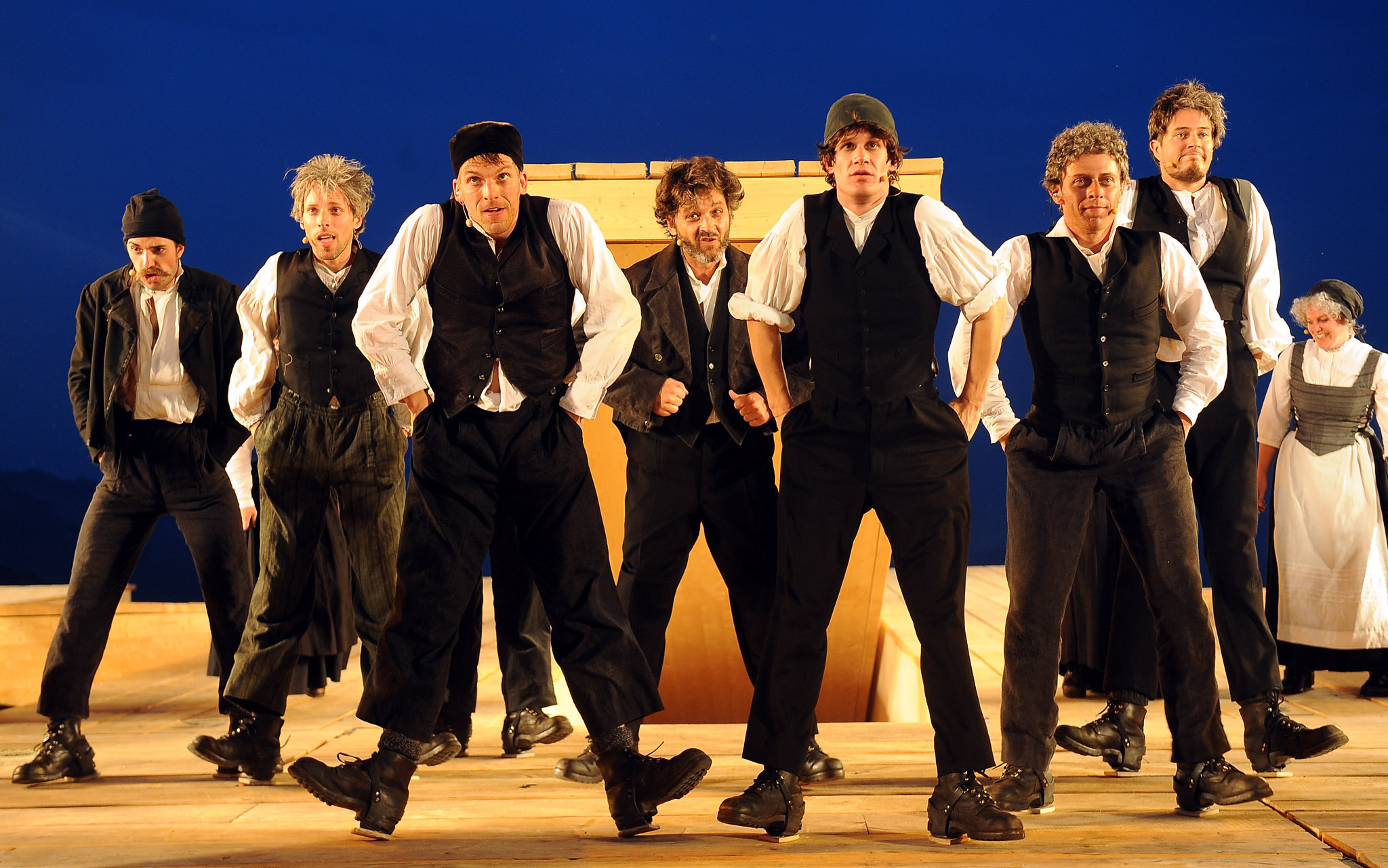 ...An die Figürchen einer Spieldose erinnert das Emmentaler Völklein, das Regisseur Stefan Huber antreten lässt auf der schlichten schrägen Holzbühne (Harald Thor), die weit in den See hinausragt. Die Frauen und Männer mit den schwarzen Hüten, den schweren Schuhen, den halbleinenen Kitteln und den weiten Röcken drehen auf, als wären sie aus einer verstaubten Gotthelf-Vitrine abgehauen, befreit für eine lange Nacht. Und einmal aufgezogen, sind sie kaum mehr zu stoppen. Doch plötzlich werden sie wieder