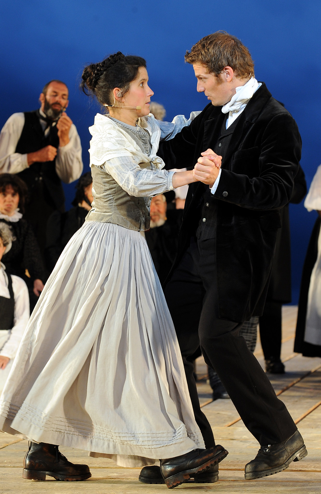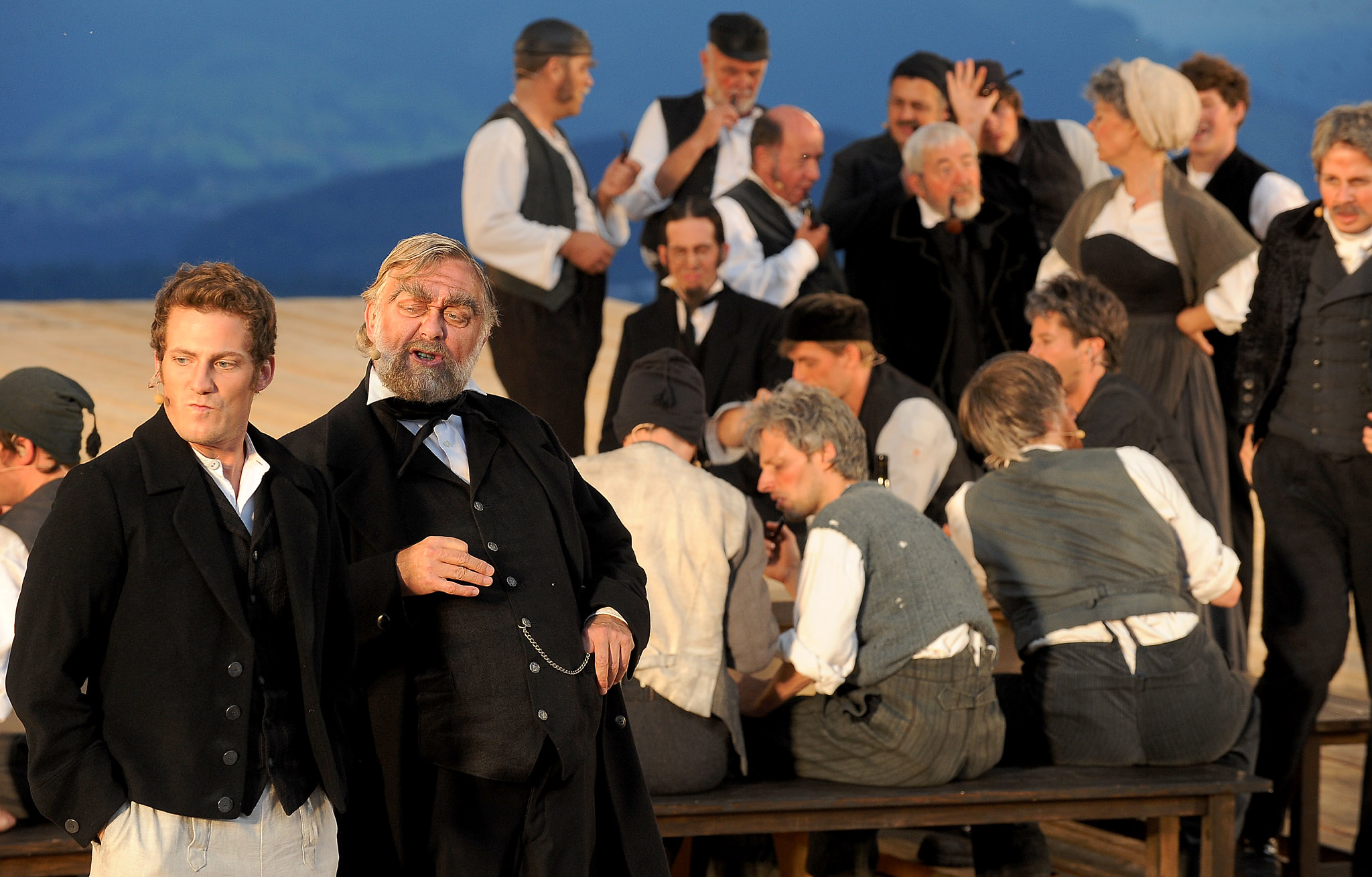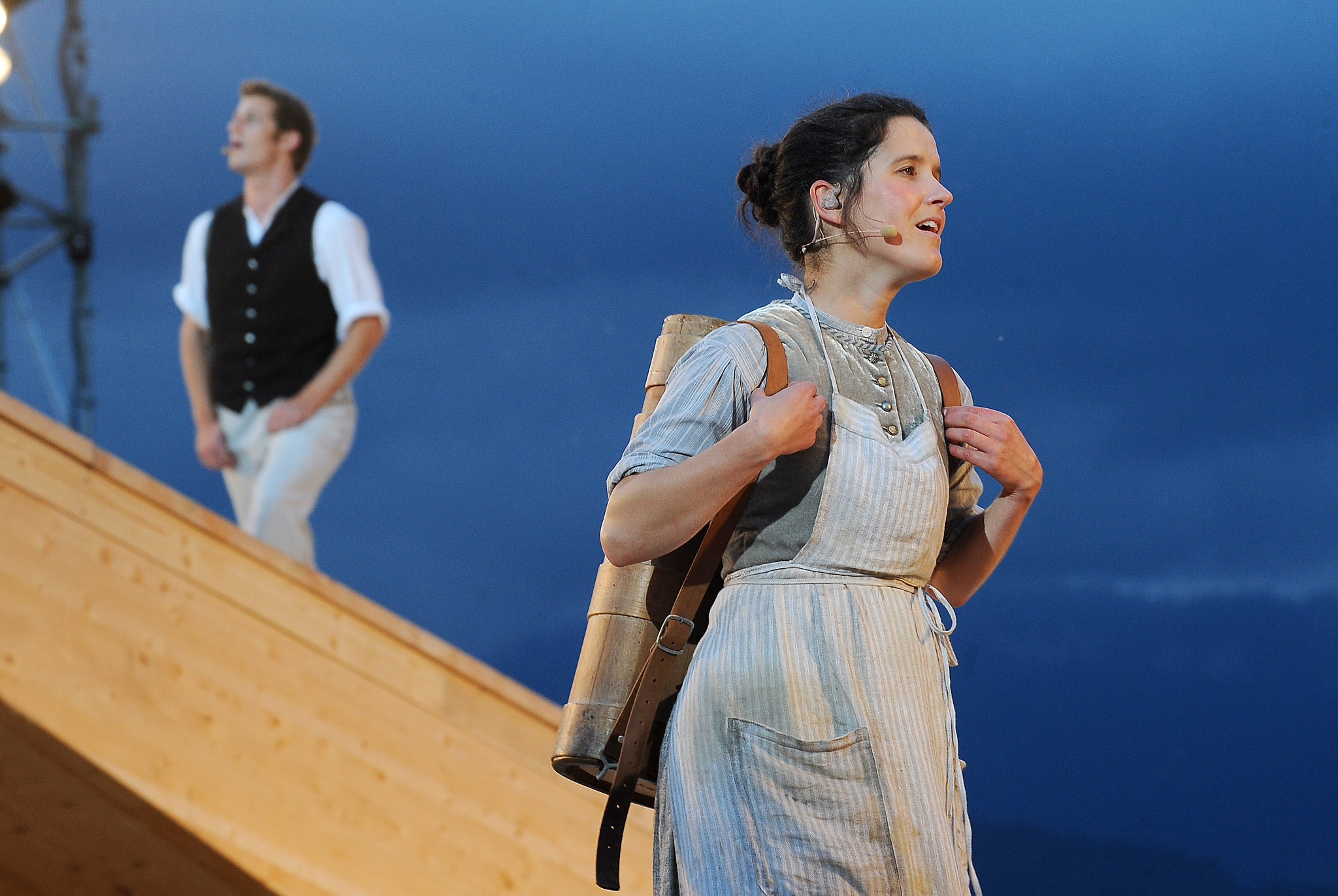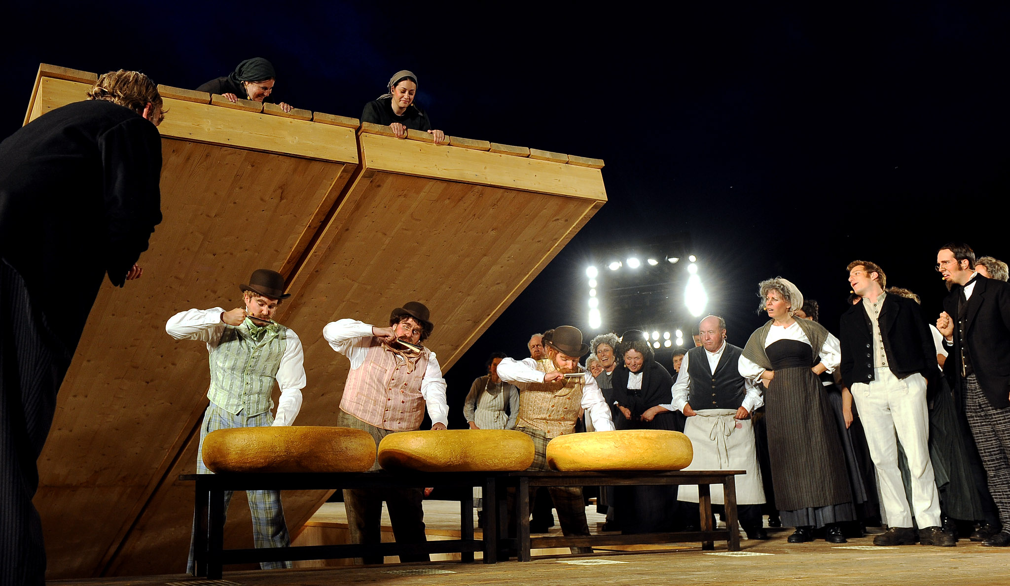 Mischung walten. Wuchtig sind die deftigen Dorfszenen choreografiert, in denen - ob es zur Versammlung oder zum Tanzgeht - immer die einen das Opfer für die Lust der anderen sein müssen. Filmreif ist die tumultuöse Schlägerei inszeniert, in der das Käsefieber kulminiert. Starke, einsame Momente auf der weiten Bühne gibt es für Änneli und Felix, das Liebespaar, das nie so recht weiss, wie ihm geschieht, weil ein Verdingkind und der Sohn des Ammanns eigentlich nicht füreinander bestimmt sind. Die zarten Bande machen aus dem Hallodri einen Engel, jedenfalls in Ännelis Augen, und wie diese überirdische Erscheinung auch für uns aus dem Thunersee auftaucht und vor Eiger, Mönch und Jungfrau in die Höhe wächst, ist im Mix von Humor,