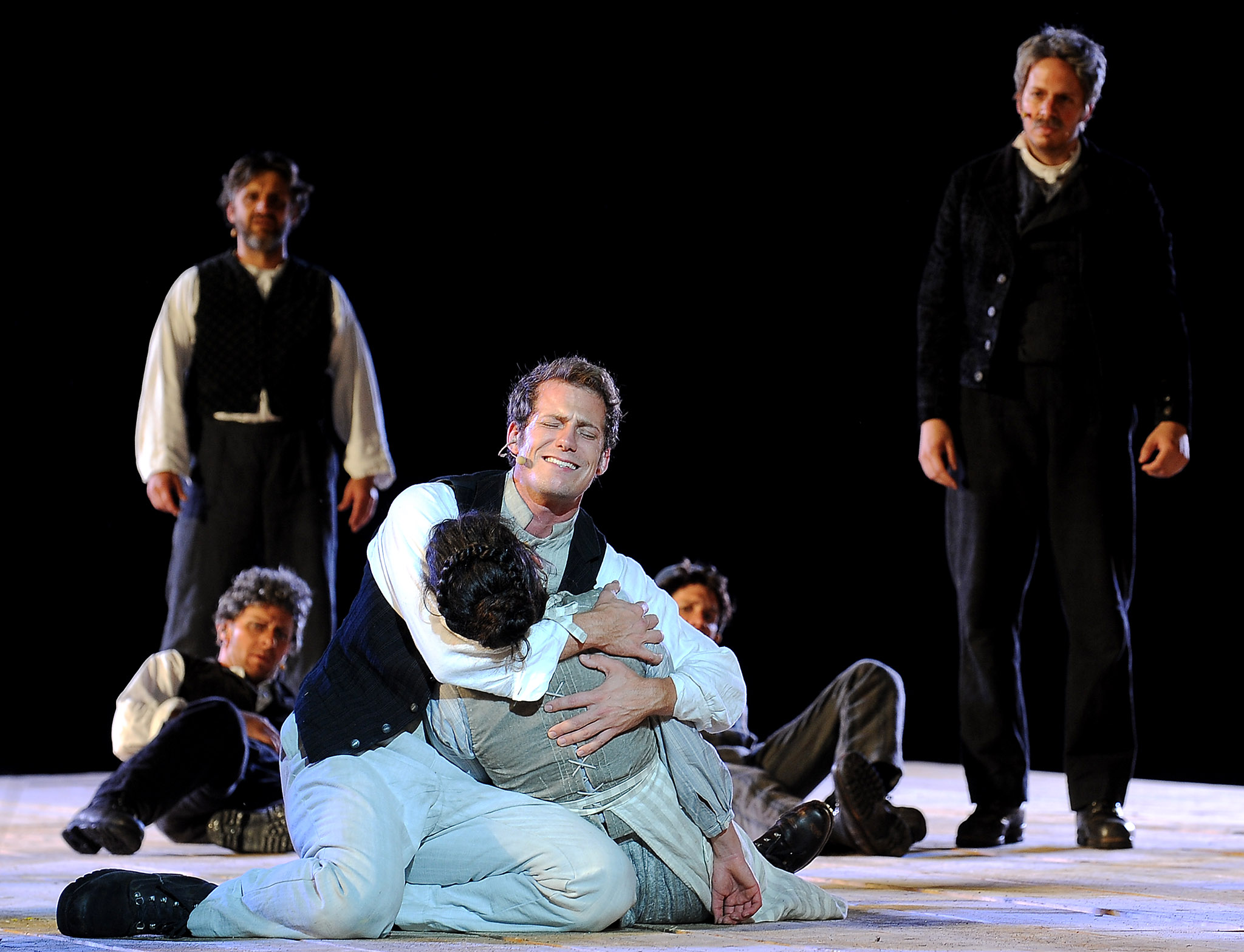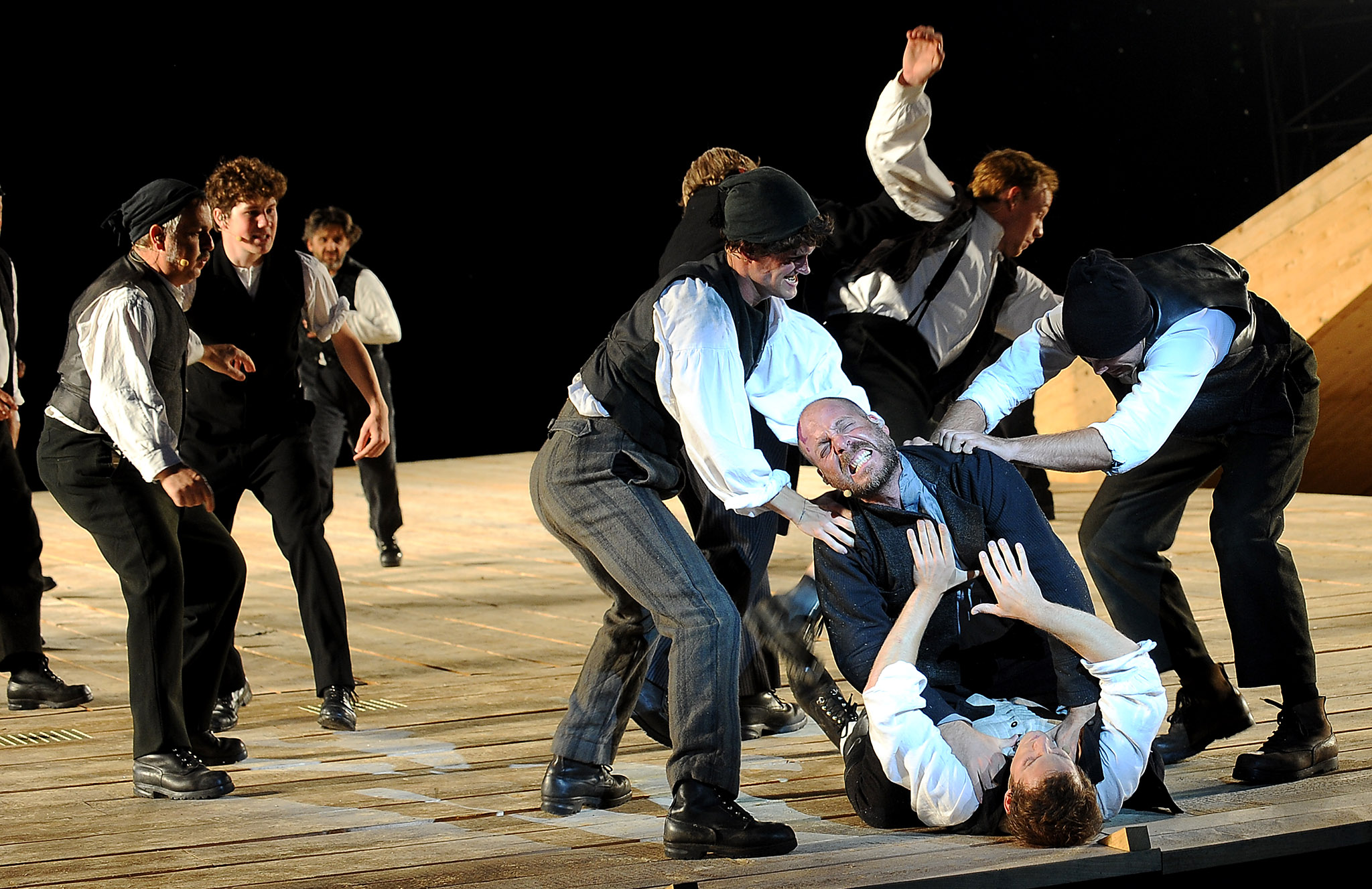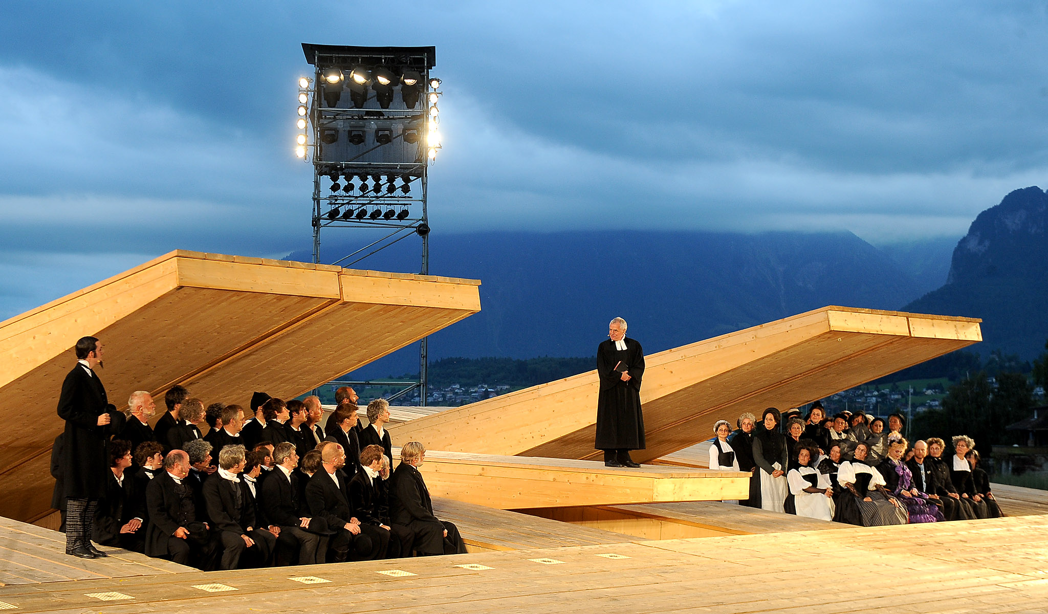 ...Wunderbar ist, dass man sich auf der Seebühne Thun nicht zur hemmungslosen Liebedienerei an der Form hinreissen liess. So dient nun ein raffiniertkonstruierter Bühnenboden zugleichals Bühnenbild, indem einzelne