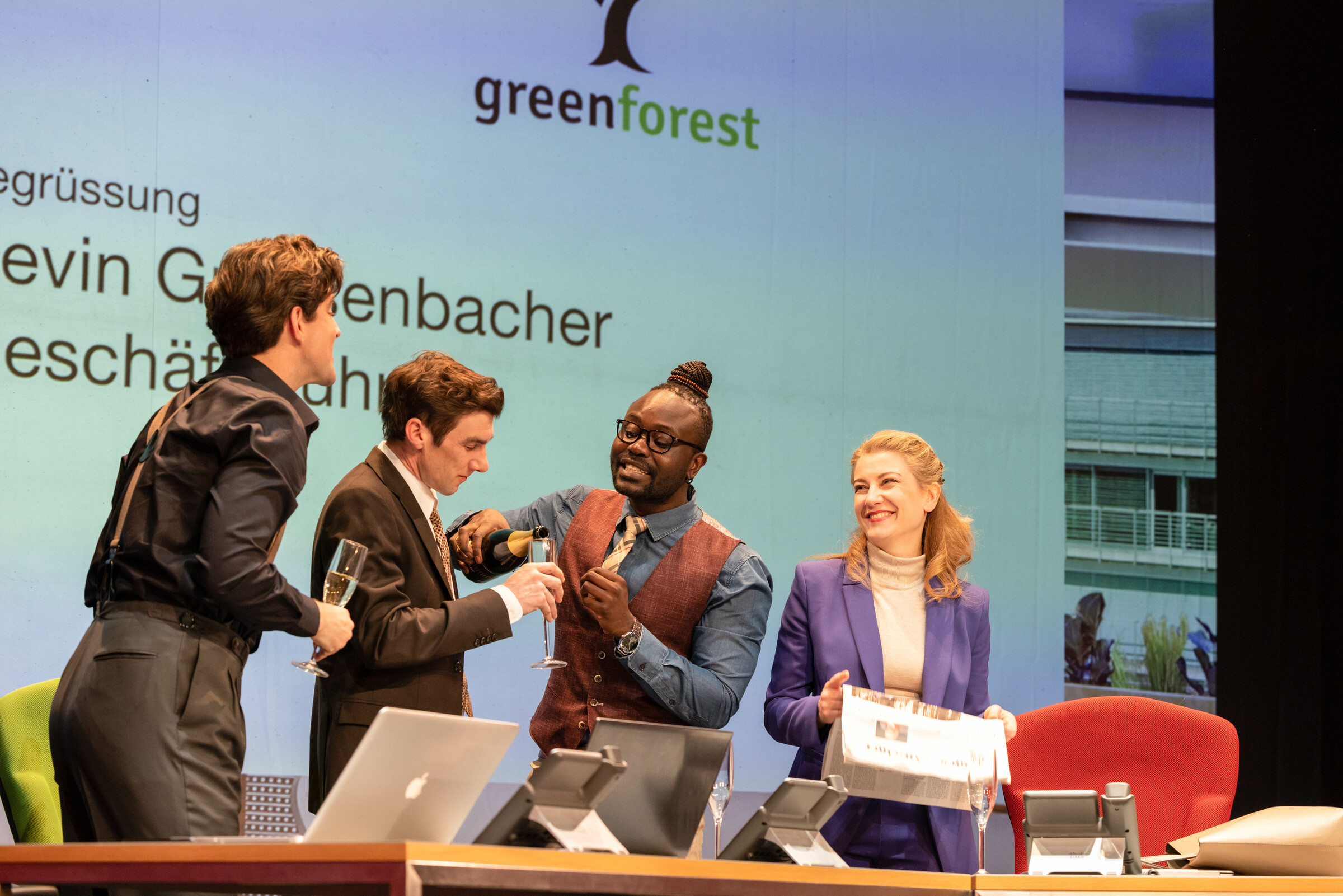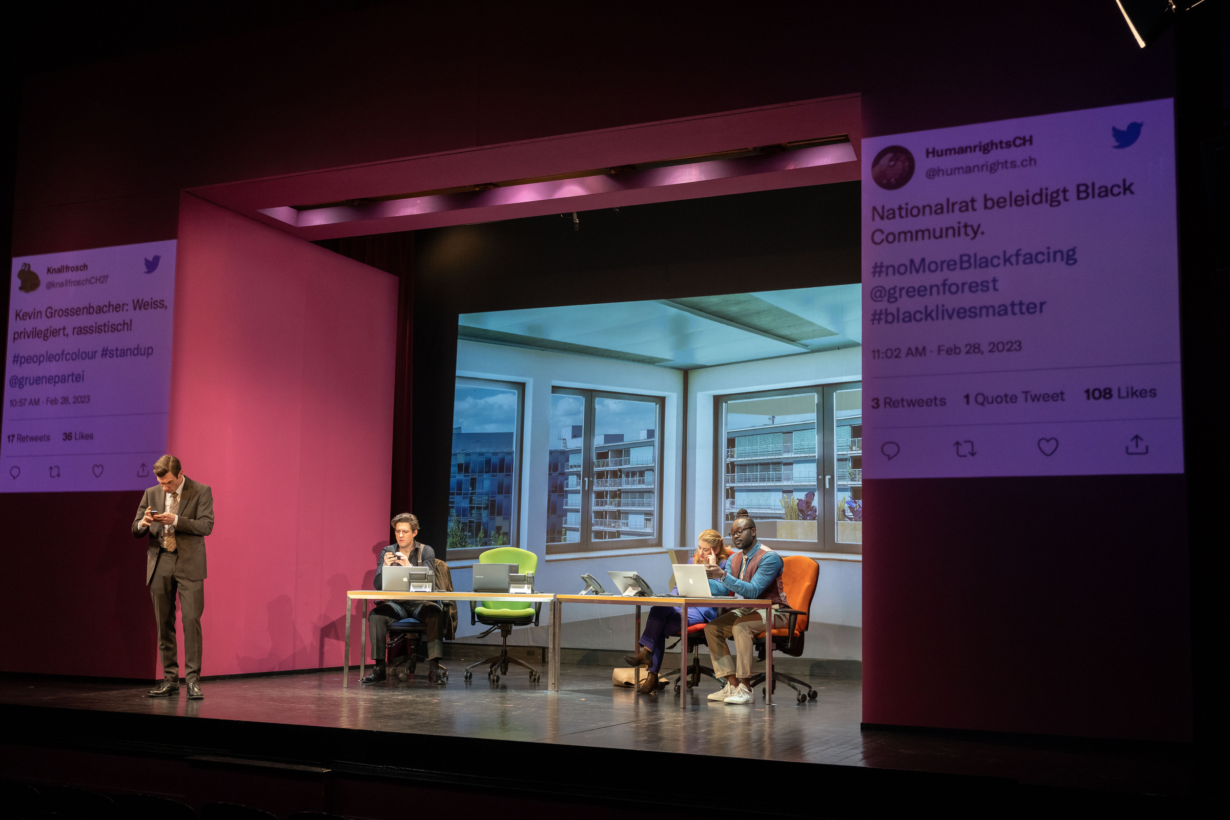 Fehler sind menschlich. Und Medien gnadenlos. «Shitstorm für Anfänger*innen» erzählt, wie ein vermeintlich lustiges Selfie / Foto das Leben und die Karriere von Kevin schlagartig verändert. Die rasante Mundart-Komödie der beiden Autoren Roman Riklin und Michael Elsener entlarvt mit beissendem Humor und witzigen Dialogen unsere Denkmuster – und lässt dabei kein Auge trocken.Bei Kevin (Aaron Hitz) läuft es rund. Als frischgewählter Nationalrat der Grünen wird er von den Medien gefeiert und als Fundraiser bei der NGO Green Forest gelingt es ihm, grosse Spendenbeiträge für die Wiederaufforstung in Sambia zu sammeln. Die Zeichen stehen auf Erfolg. Beim wichtigen Spendendinner von Green Forest in zwei Tagen soll er nun offiziell zum Geschäftsführer befördert werden. Darauf stossen seine Chefin Dunja (Julienne Pfeil), der Projektleiter Patrice (Foscky Pueta) und der PR-Verantwortliche Ruben (Diego Valsecchi) mit ihm an.Genau in diesem Moment taucht in den Medien ein Foto auf. Es zeigt Kevin an einer privaten Party, verkleidet als sein erklärtes Musikidol James Brown, mit Schoggi-Mousse im Gesicht und «I feel good» singend. Projektleiter Patrice, selbst Person of Colour, kann darüber nicht lachen. Das Bild geht viral und eine Lawine der Entrüstung gerät ins Rollen.Kevin steht von einem Moment zum anderen in der Öffentlichkeit als Rassist da und wird in einen medialen Shitstorm katapultiert. Die ersten Spender*innen distanzieren sich von ihm und melden sich vom Dinner ab. Dunja und ihre drei Mitarbeiter verstricken sich mehr und mehr in hilflosen Erklärungen und Rechtfertigungen, die sich als Bumerang erweisen und alles nur noch schlimmer machen. Kevin sieht sich gezwungen in die Offensive zu gehen und ist bereit, sein bestgehütetes Geheimnis preiszugeben. Die Autoren Roman Riklin und Michael Elsener sezieren lustvoll aktuelle Gesellschaftsdebatten und entlarven mit frechen Dialogen tief sitzende Denkmuster. Obschon man sich dabei durchaus selbst hinterfragen darf, wird man stets hervorragend unterhalten. Denn das Stück kommt nicht etwa belehrend mit dem Zeigefinger daher, sondern ist originell und schlagfertig. Die Frage, ob man über ernste Themen überhaupt lachen darf, kann getrost mit «Ja» beantwortet werden. Oder um es mit den Worten von Roman Riklin zu sagen: «Gerade tabuisierte Themen, die so ernst sind, dass man sich fragt, ob es dann da wirklich was zu lachen gibt, sind für eine Komödie meiner Meinung nach besonders geeignet.»Regie führt der Zürcher Stefan Huber (u.a. «Achtung Schwiiz!» und «Business Class»). Für die Ausstattung (Bühne und Kostüme) ist Heike Seidler verantwortlich.Inszenierung «Lieber Gurken auf den Augen als Schoggi-Mousse im Gesicht» Bemerkenswert und gut gelungen ist auch die multimediale Inszenierung mit eingeblendeten News der sich überschlagenden Meldungen und den Twitter- und Instagram-Posts der Schweizer Promiszene. Zum roten Faden entwickelt sich dabei das Schoggi-Mousse, das Kevin bei seiner angeheiterten James Brown-Parodie ins Gesicht geschmiert wurde. Herrlich und selbstironisch wenn im Hintergrund etwa die Nachricht von Patty Boser eingeblendet wird «Lieber Gurken auf den Augen als Schoggi-Mousse im Gesicht», Andreas Glarner im Gegenzug. «Schoggi-Mousse» für alle fordert oder Roger Köppel tweetet «Die Grünen canceln sich selbst. Ich bin wohl bald arbeitslos. #help #rav #SchoggiGate».Das Publikum erlebt so einerseits die persönliche Not der Hauptfigur und leidet mit ihm mit, entwickelt aber auch Verständnis für versteckte Verhaltensmuster, die sich mehr und mehr offenbaren.Schlicht und einfach gute Unterhaltung.Fazit: Das Stück bringt die aktuellen Diskussionen darüber, was man darf und was eben nicht auf den Tisch soll, ohne dabei zu moralisieren. Am Ende ist es schlicht und einfach gute Unterhaltung. Und wenn sich die Besucher nicht nur während der Vorstellung bestens amüsieren, sondern danach noch den einen oder anderen Gedanken mit auf den Heimweg nehmen, sind sicher auch die beiden Autoren mit dem Ergebnis zufrieden. «Shitstorm für Anfänger*innen» ist noch bis zum 26. März 2023 im Casinotheater Winterthur zu sehen. Tickets und weitere Informationen gibts unter casinotheater.ch.