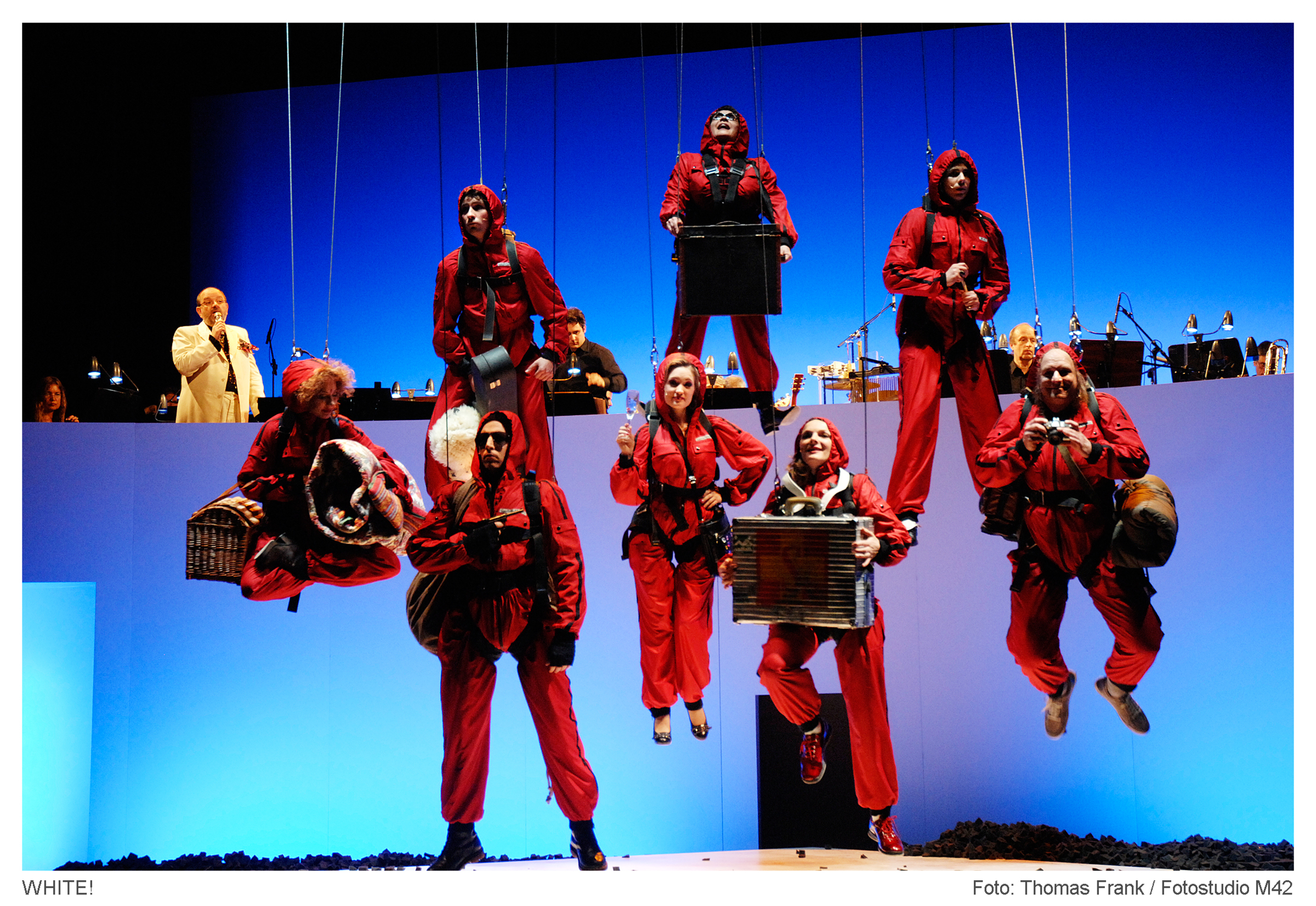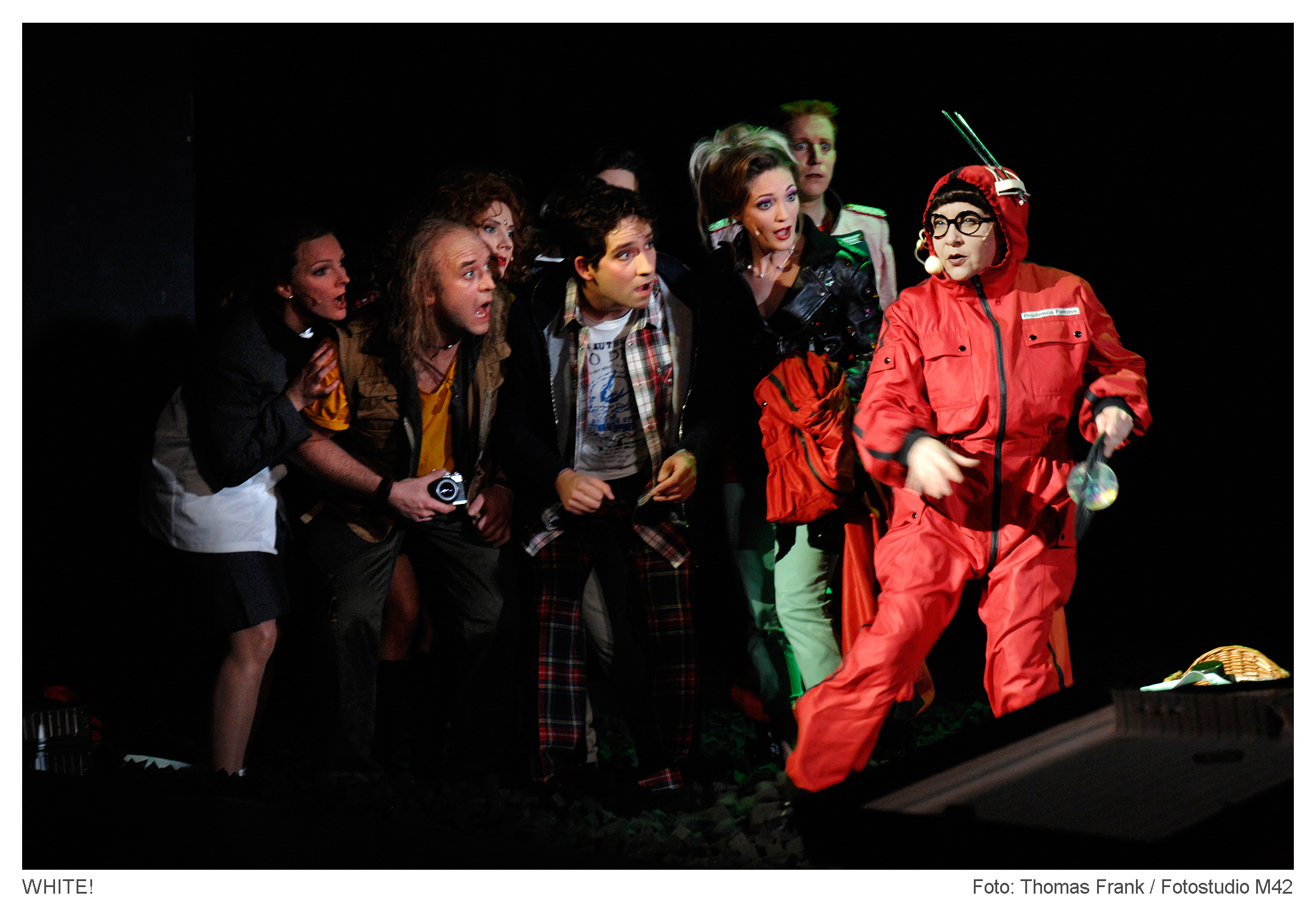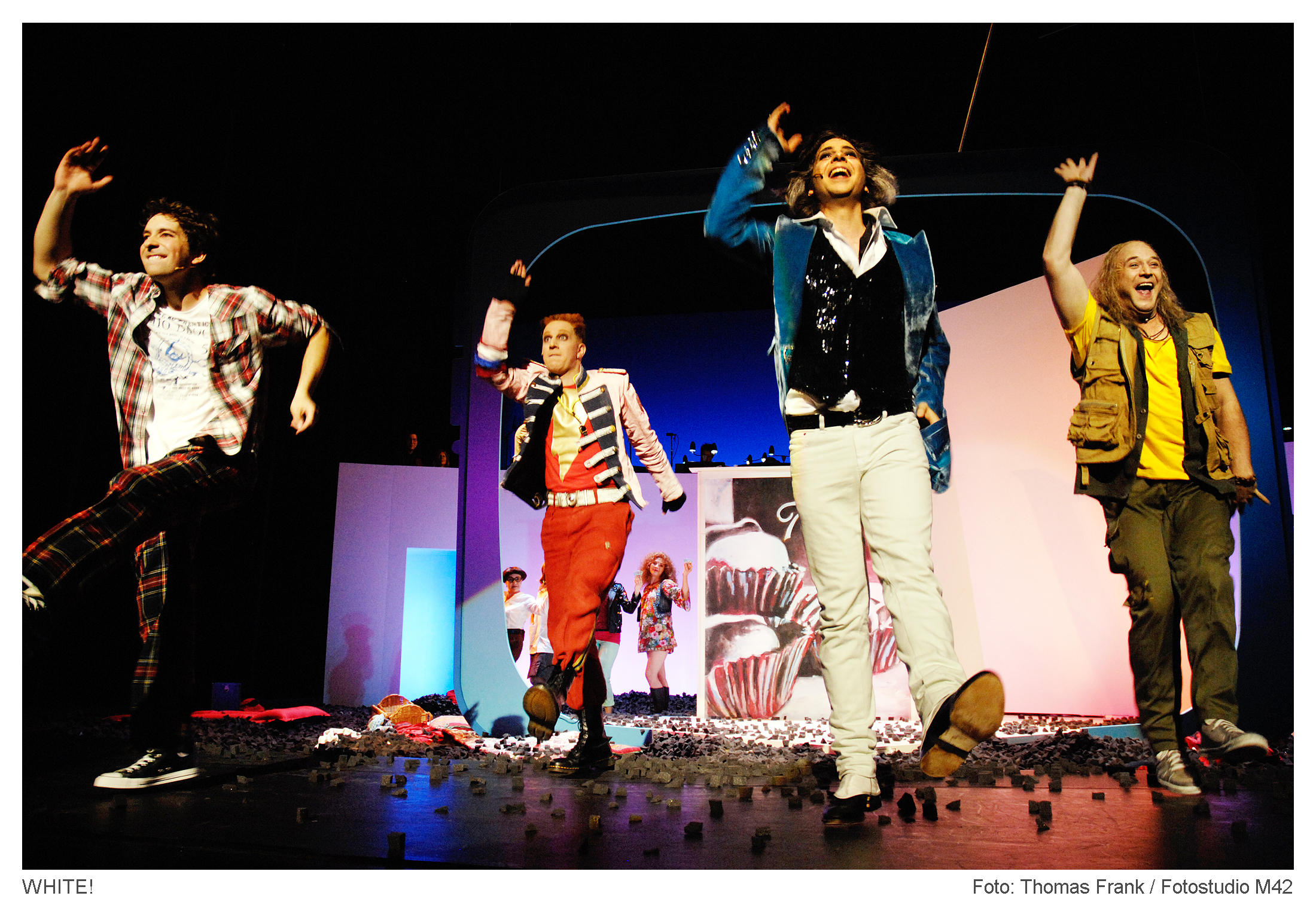 Es ist zunächst schwarz, wenn man im Heilbronner Theatersaal den Blick vor Beginn auf die Bühne richtet. Hier gibt es gleich "White - The Album! The Beatles! 1968!" Was ist das bloß? Denn so richtig eine Chance bekommt man nicht, sich vorher schlau zu machen. Es geht um die von den Beatles aufgenommene Doppelschallplatte "The Beatles", die wegen ihrer Hülle allseits als Weisses Album bezeichnet wird und 30 Lieder unterschiedlichster Stilrichtungen beinhaltet. Es befinden sich acht singende Schauspieler auf der Bühne, deren Rollennamen einzelnen Liedtiteln entlehnt sind. Ein 30-köpfiges Orchester begleitet sie. So viele?! Michael Frei leitet das beeindruckende Orchester, die Arrangements stammen ebenfalls von ihm. Hat der nicht schon mit dem Regisseur Stefan Huber die zwei anderen Abende "Pepper!-Der Beatles-Trip" am 8. April 200 an den Städtischen Bühnen Freiburg und " A Day On Abbey Road" am 15. Dezember 2007 in Heilbronn ersonnen? Oho! Was sich dann in zweimal 60 Minuten auf der Bühne ereignet, ist begeisternd! Wie aus ursprünglich zusammenhanglosen Liedern eine Geschichte zum Leben erweckt wird, unterhält auch den, der das Album nicht kennt oder mit der Musik nichts anzufangen weiß. Zu Beginn landet eine Raumfahrertruppe an Fallschirmen im schwarzen Nichts, doch unter dem schwarzen, schaumstoffartigen Untergrund tut sich etwas auf: Das weiße Album! Der Raum wird hell, das Orchester, im Hintergrund in erster Etage platziert, wird sichtbar, und so manche Überraschung und räumliche Veränderung ersteht geheimnisvoll aus dem Bühnenboden. Karel Spanhak hat wieder mit großer Phantasie dem Einspartentheater zu einem effektvollen Bühnenbild verholfen. Heike Siedlers Kostüme unterstreichen die recht unterschiedlichen Charaktere der Besetzung, die im Verlauf verschiedene Situationen des Campierens oder auch Träumens durchleben. Mit Eric Rentmeisters Choreographien wird nicht nur der Schritt zur Revue oder zum Musical gewagt, sondern dieser auch erfolgreich getan. Jeder der Protagonisten hat sein Solo, geschickt verteilt in den Ensembles, so dass nie Langeweile aufkommt und mit Spannung die nächste unerwartete Wendung erwartet wird. Alexander von Hugo begeistert als vielseitiger MC - immer speziell, interessant, witzig. Zum Ragtime "Honet Pie" wird sogar gesteppt! Es gibt vier Girl, mit Showfächern und eine Kickline! Ukulele Boy (Felix Jeiter) setzt immer wieder Akzente und leidet doch vor allem unter Captain Marvel (Gabriel Kemmether), der spontan sein geliebtes Instrument zertrümmert. Angelika Hart ist die suchende und findende Prudence Farrow. Fotograf Rikki Cooke (Tobias D. Weber) dokumentiert die Entdeckungsreise mit Ärztin Dr. Sadie Robert (Sylvia Bretschneider), Linda West (Julia Klotz) und Martha (Susan Ihlenfeld). Zwar werden Dialoge nicht wirklich vermisst und die Charaktere sind klar, aber das "Wer ist wer?" ist extrem schwierig. Da hätte Dramaturgin Karoline Felsmann ansetzen müssen. Im kostenlosen Programmheft finden sich zwar Texte über die Bedeutung des Albums, aber nichts über das Stück, die Charaktere, Fotos oder Liedabfolge. Stefan Huber schuf grosse, beeindruckende Bilder, die unerwartet begeistern. Inhaltsbedingt sind die Lieder auf Englisch und so manche Handlungslinie verliert sich in der Erinnerung des grossen Ganzen. Musikalisch höchst interessante Arrangements lassen bekannte Melodien auf neue Weise zum Theaterlied werden. Denn neben der Wiedererkennung geht es eben um eine neue Sichtweise auf ein Musikalbum. Wenn am Schluss das Abenteuer endet und die Darsteller wieder gen Bühnenhimmel schweben - welch ein Bild! - dann ist der Weg frei für Applaus, Zugaben und stehende Ovationen! Ein Zauber!